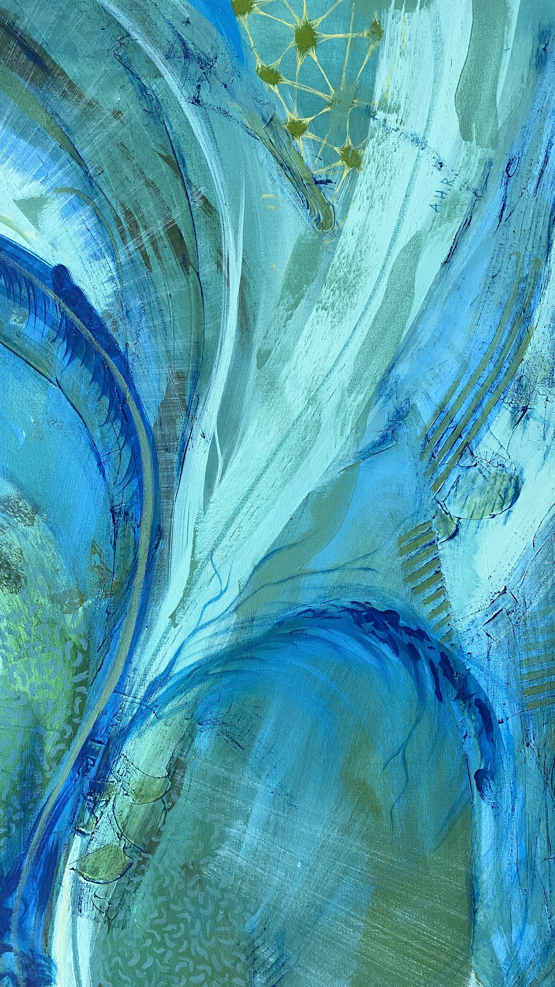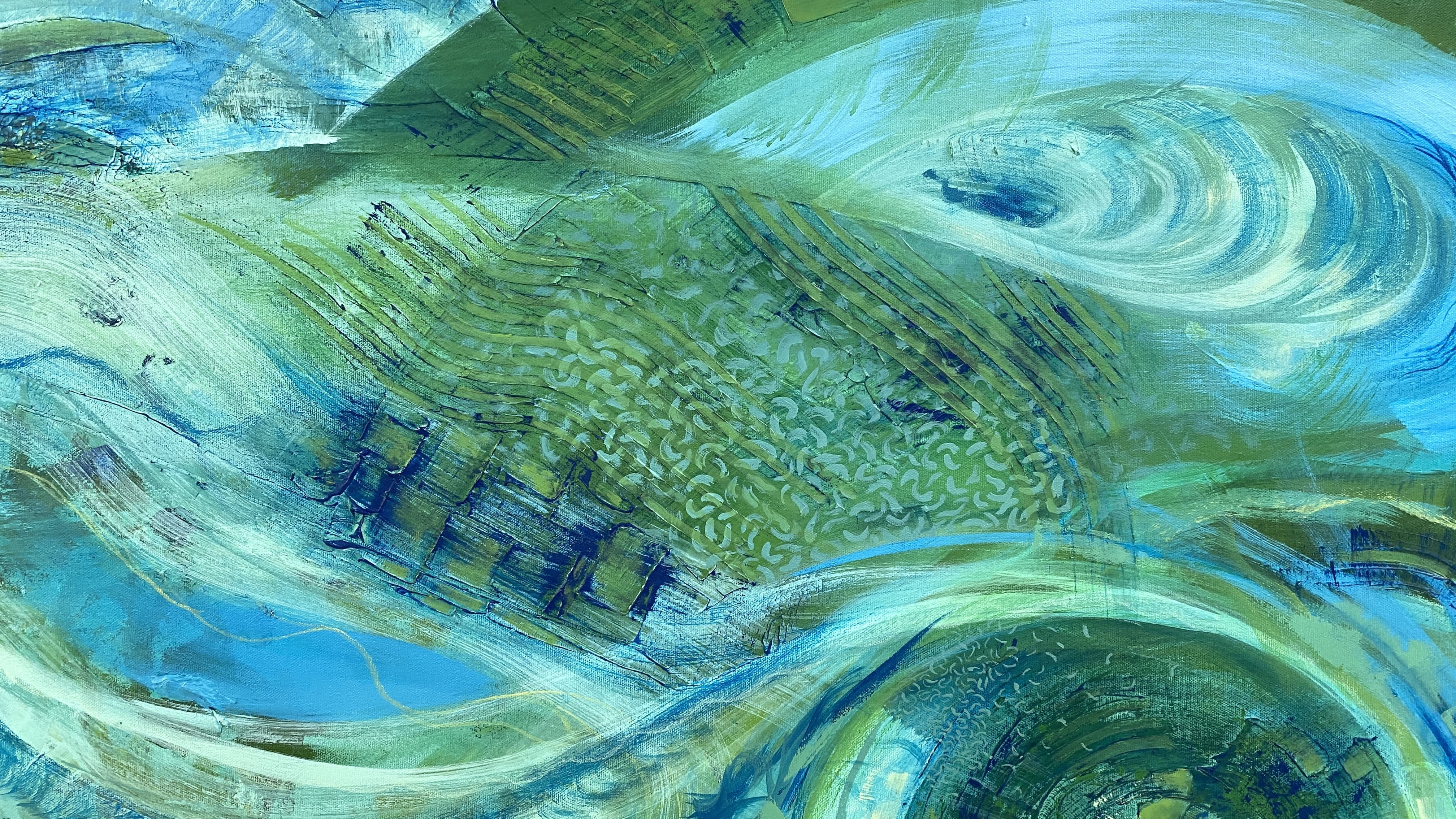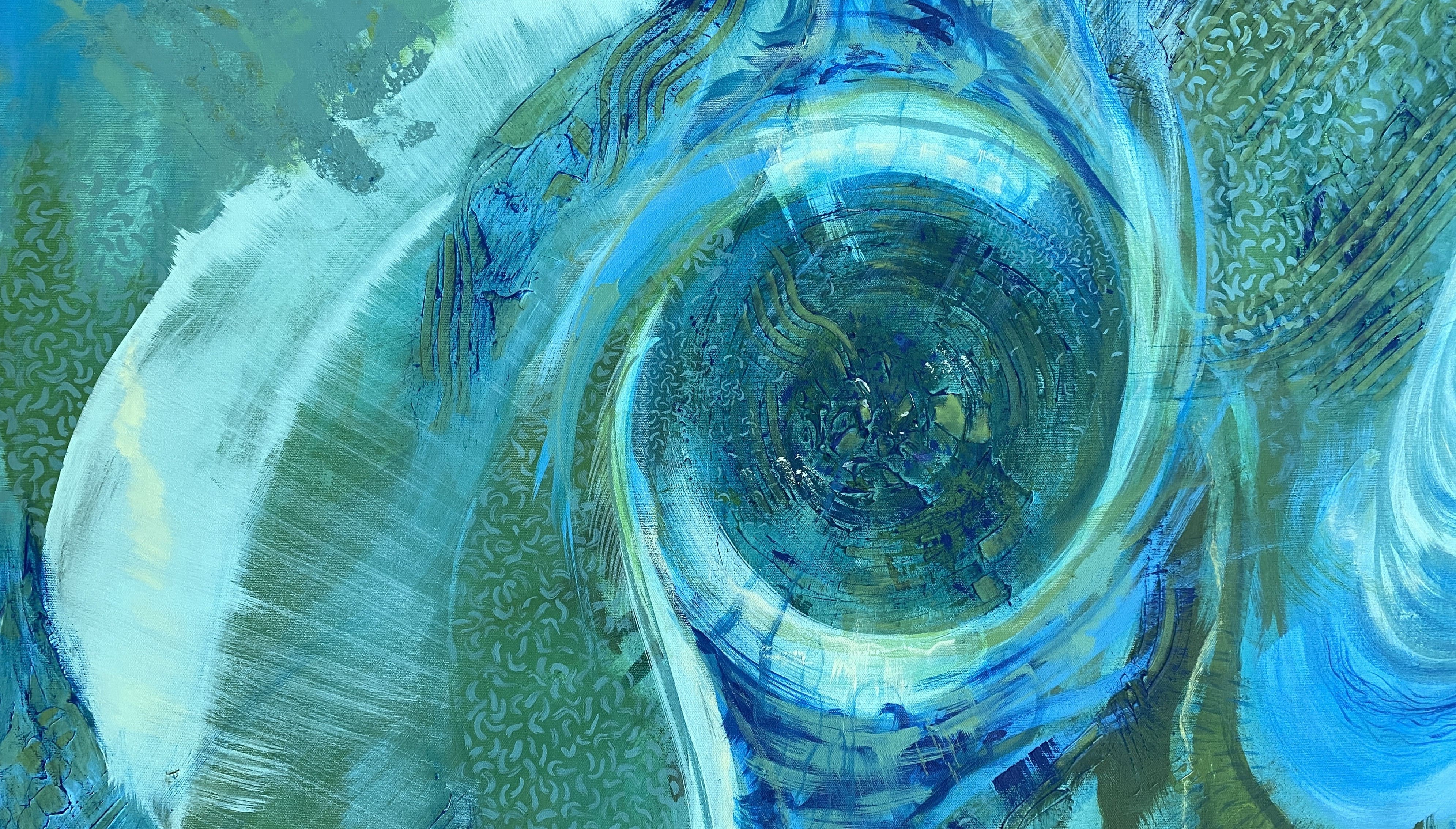 Inspired by seashells and fossils. Patterns found in nature unfold into a large spiral directed toward the core. The spiral, as a symbol of constant change, forms the center of the painting. The formations and textures recall the arrangement and constructive processes present in many natural systems. These patterns appear in water lily cells observed under a microscope, in wasp nests, and in our own skin cells.